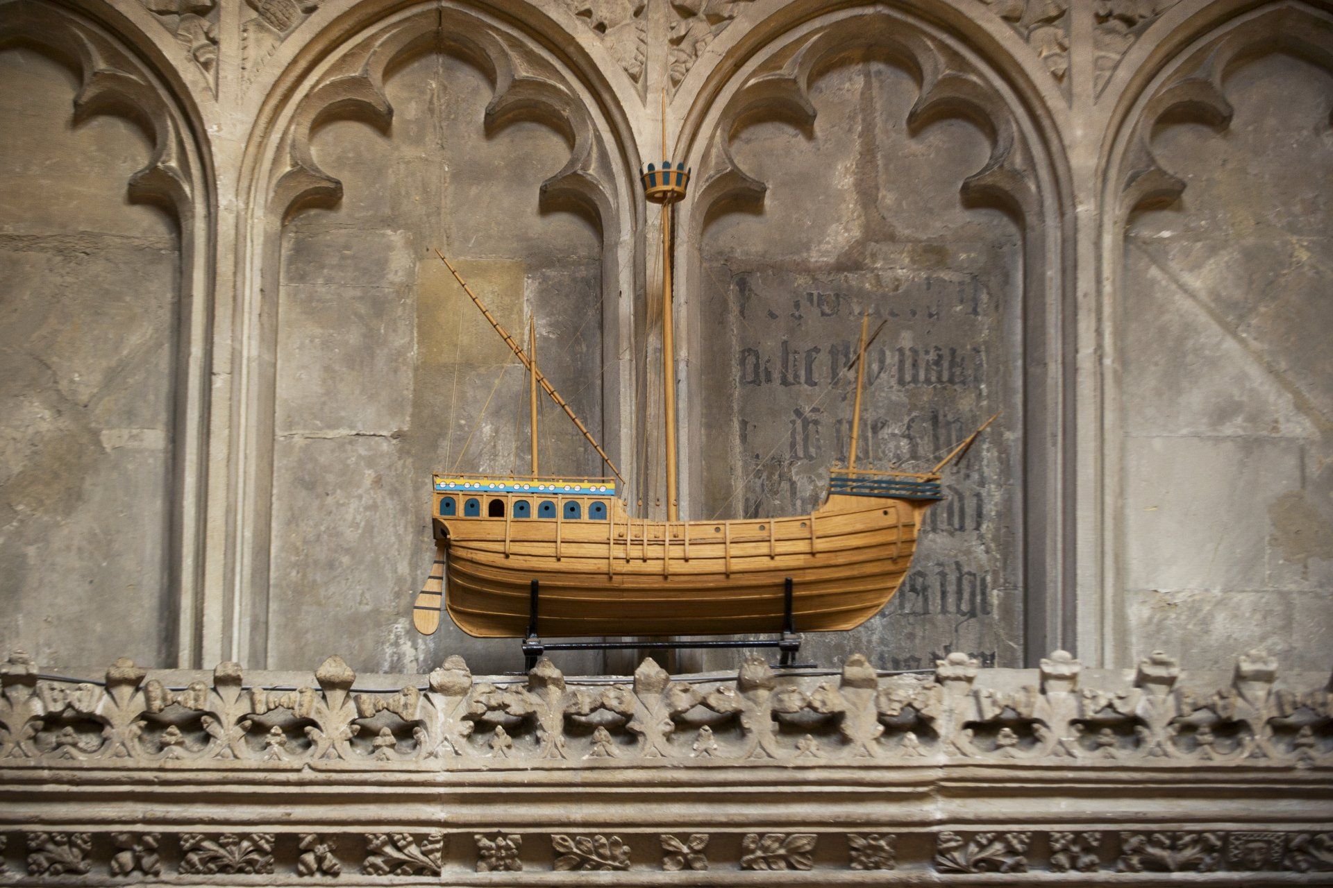 This extraordinary adventure is celebrated in the church by a whalebone, brought back by Cabot, a fine model of the Matthew (above the north door) and a stained glass window showing John, three of his sons who sailed with him, and their brave little ship.